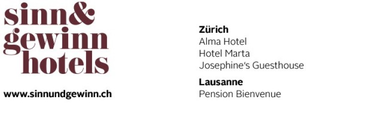 Die Sinn & Gewinn Hotels führen in der Stadt Zürich drei Beherbergungsbetriebe: Das gemütliche Alma Hotel im Seefeldquartier, das unkomplizierte hotel marta im Herzen der Altstadt und das urbane Josephine's Guesthouse nur wenige Schritte vom Stauffacher entfernt.